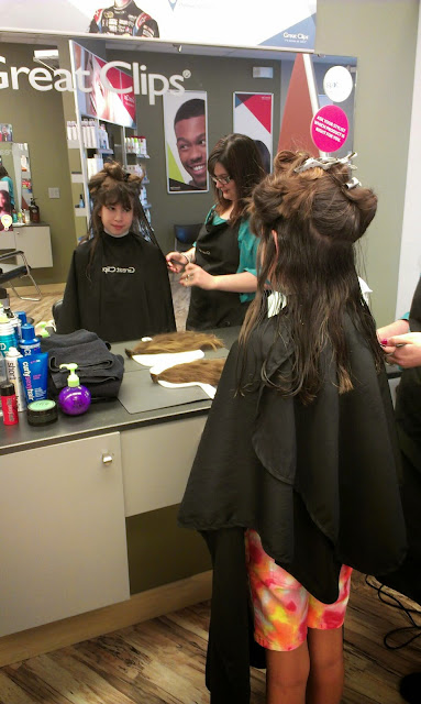 I'm no hair stylist, so I have always told them that if they wanted it cut for real, instead of just a trim, I would take them to a salon. I also told them that I would not make them get it cut. That decision was theirs to make...the when, and how much to cut...completely up to them. Some people, who shall remain nameless, thought I was crazy for leaving that decision up to the girls...or for letting their hair grow so long. Homeschool stereotypes and all. But when you have that much hair, with the potential of being naturally wavy or curly, it's a personal decision. A decision made my the one with the hair. Of course, when talking about haircuts, I always give the sound advice not to layer it because of the nature of their hair. The liklihood of it turning curly is great and layers don't do well with naturally curly hair. Yes, speaking from experience. So the discussion of a hair cut increased over the past month or so. Then I shared a story about a student at work that donated her hair to Locks of Love, then a friend of theirs at church did the same. That was it.